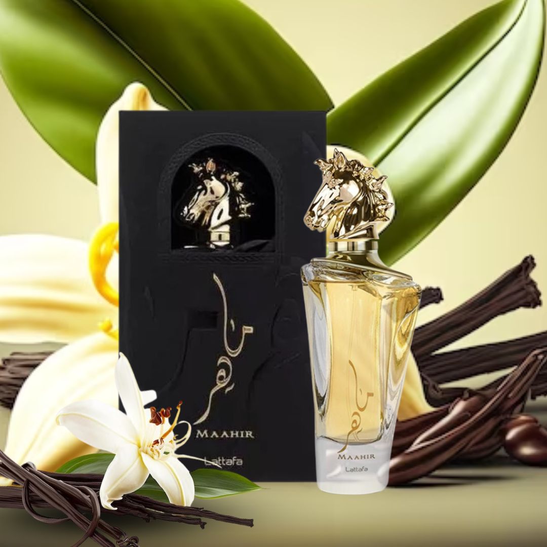 El perfume Maahir Lattafa es una fragancia encantadora que comienza con vibrantes notas altas de frutos rojos, melocotón y bergamota, que despiertan los sentidos con su dulzura afrutada y cítrica. En el corazón de la fragancia, se entrelaza un ramo floral de jazmín, peonía y lirio rojo, añadiendo una capa de elegancia y profundidad. La base es una armonía cálida y seductora de sándalo, flor de vainilla y almizcle, que ofrece un final suave y cautivador.