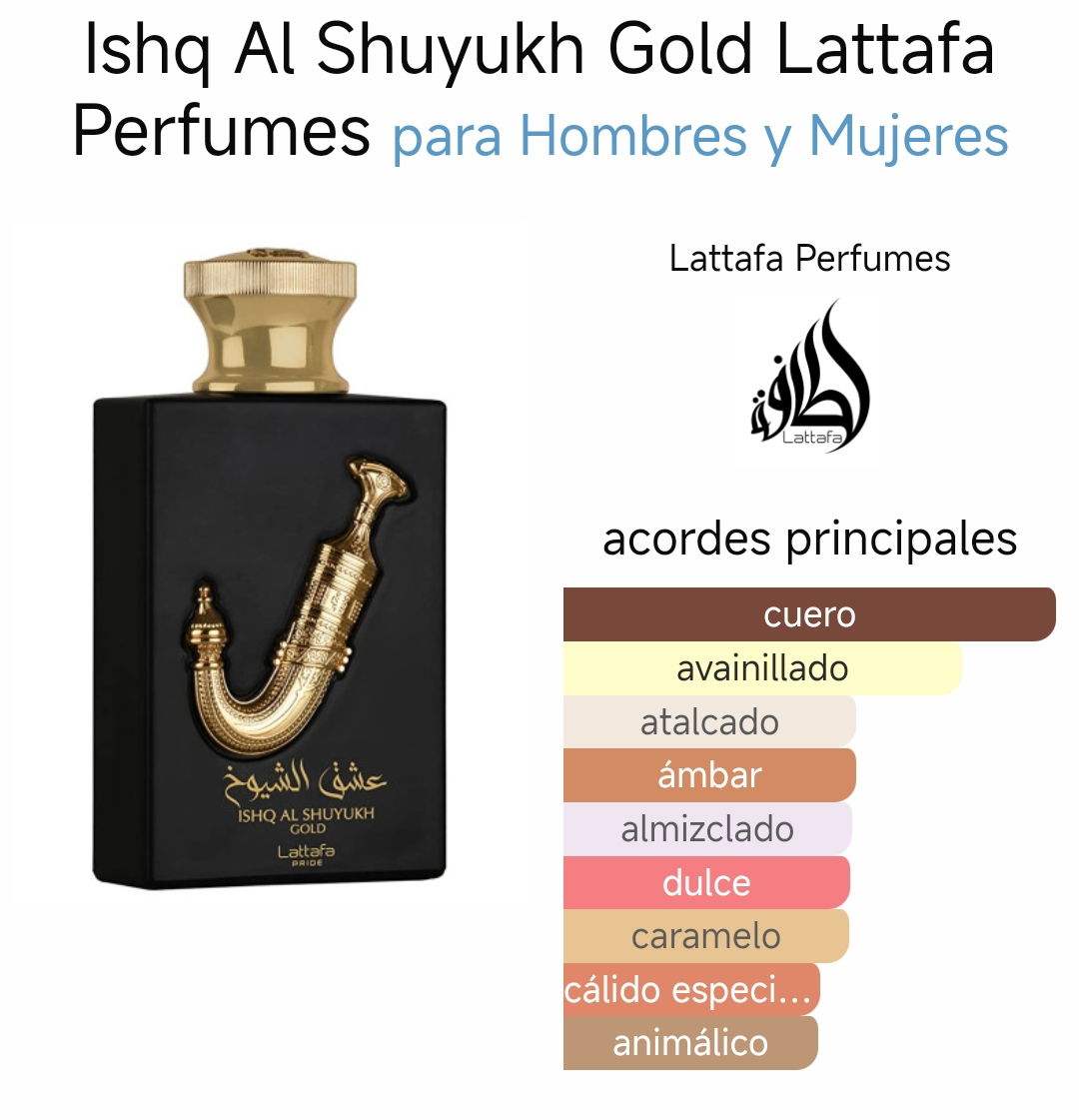 Ishq Al Shuyukh Gold de Lattafa Perfumes es una fragancia de la familia olfativa Oriental Vainilla para Hombres y Mujeres. Las Notas de Salida son caramelo y azafrán; las Notas de Corazón son gamuza, cuero y haba tonka; las Notas de Fondo son vainilla, ámbar y almizcle.