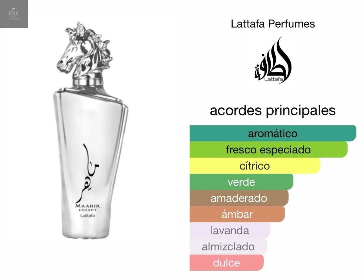 El perfume Lattafa Maahir Legacy es una esencia masculina sofisticada y cautivadora. Las notas de salida son una combinación refrescante de lima, menta, pomelo, lavanda y piña. En el corazón, la fragancia se profundiza con notas de bayas de enebro, pimienta negra, romero, geranio e incienso, creando un contraste especiado y ligeramente floral. El final está marcado por una base robusta y duradera de ambroxan, musgo de roble, vetiver, cachemira y haba tonka, que le da al perfume una firma única.