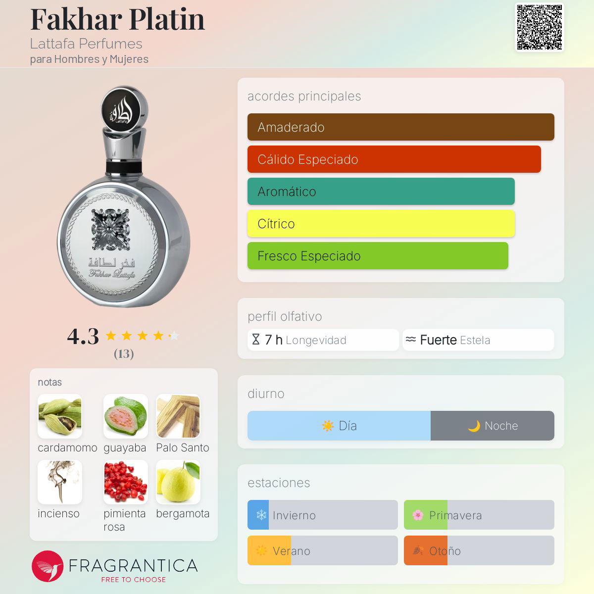 Fakhar Platin es una fragancia aromática fougère unisex que equilibra frescura e intensidad con elegancia. Las notas de salida aportan la vivacidad de la bergamota, el toque exótico del cardamomo y el toque picante de la pimienta rosa. En el corazón, la dulzura de la guayaba se funde con el jengibre y la lavanda, creando un acorde envolvente. El fondo se tiñe de palo santo, incienso y sándalo, dando como resultado un aroma sofisticado, impactante y versátil.