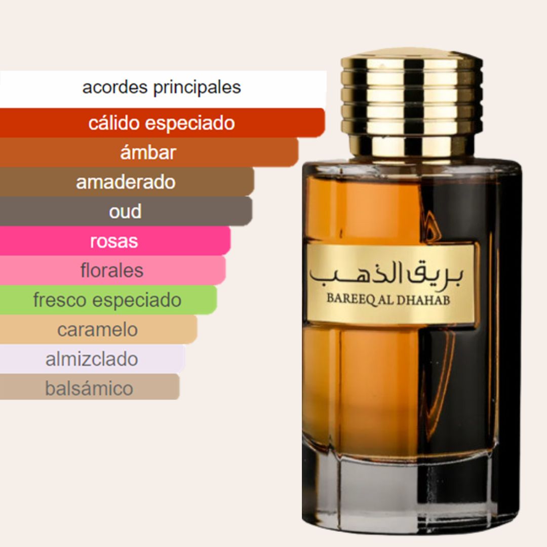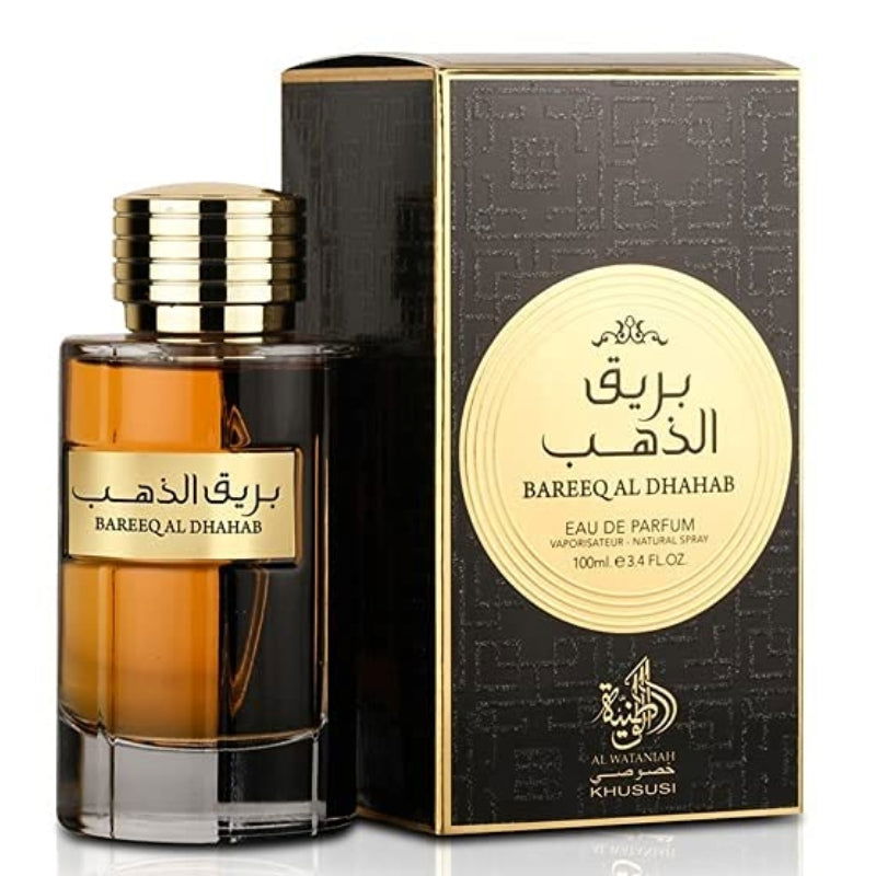 Bareeq Al Dhahab es un Eau de Parfum oriental masculino de Al Wataniah, lanzado en 2022. Con notas de salida de azafrán, rosa y pimienta; un corazón de oud, caramelo, pachulí y notas florales; y un fondo de incienso, ámbar, almizcle y notas amaderadas, ofrece una fragancia intensa y sofisticada. Ideal para ocasiones especiales y para la noche.