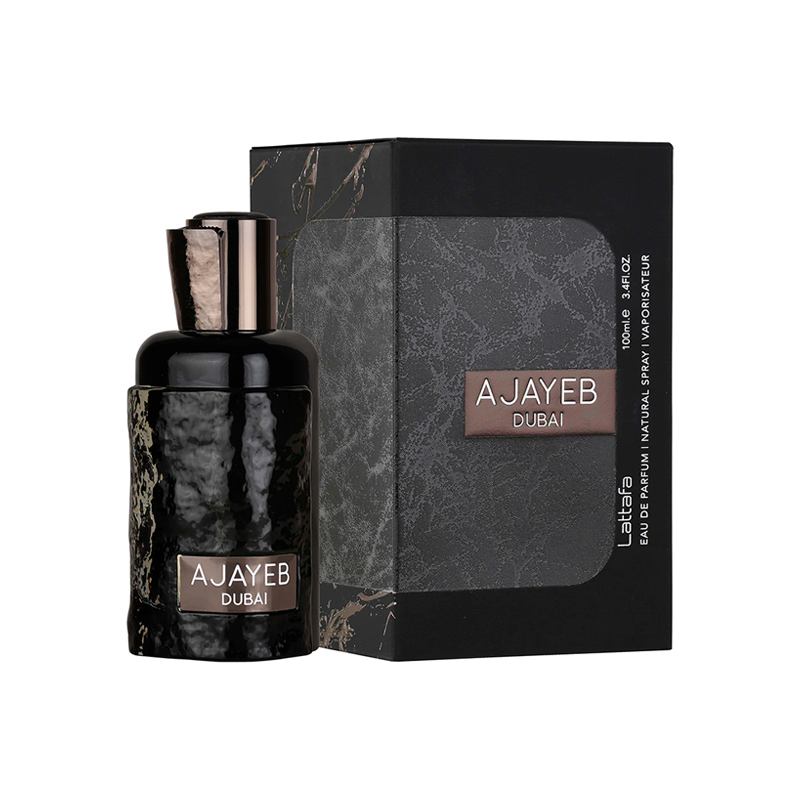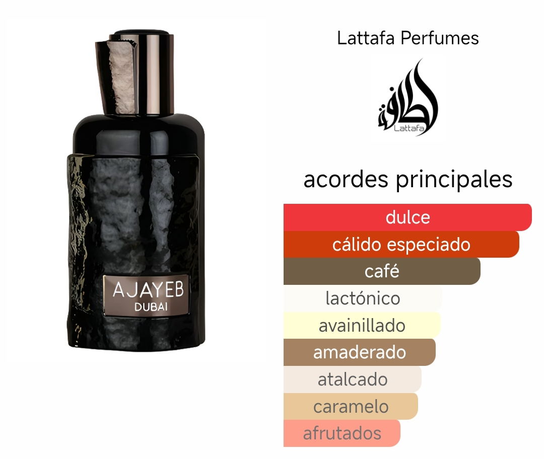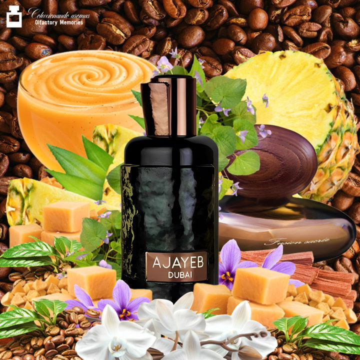 Ajayeb Dubai de Lattafa Perfumes es una fragancia de la familia olfativa para Hombres y Mujeres. Esta fragrancia es nueva. Ajayeb Dubai se lanzó en 2023. Las Notas de Salida son azafrán y piña; las Notas de Corazón son café y hojas de violeta; las Notas de Fondo son Caramelo de mantequilla, vainilla y sándalo.