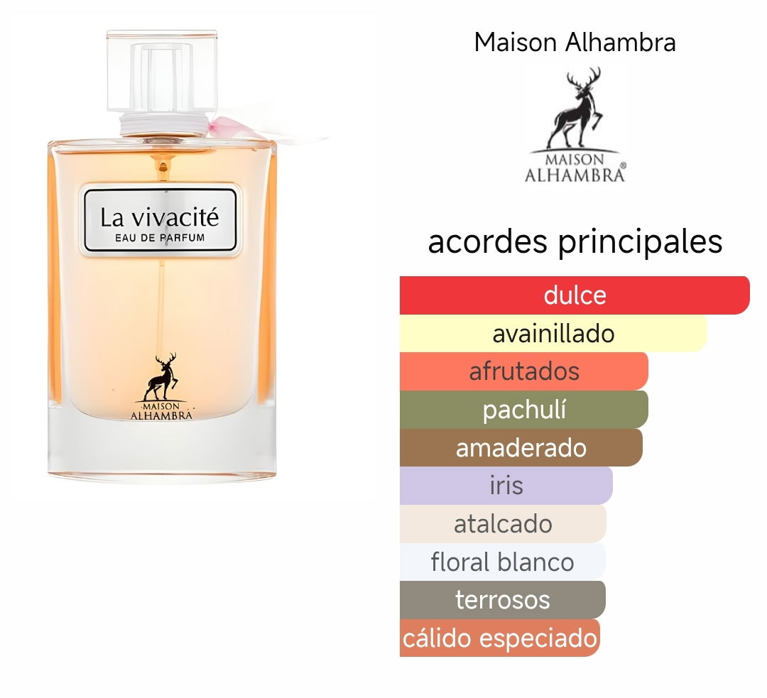 La Vivacité es una fragancia femenina floral y afrutada que irradia encanto y energía. Sus notas de salida combinan la dulzura de la grosella negra con la suavidad de la pera, creando una salida vibrante y encantadora. En el corazón, el iris, la flor de azahar y el jazmín revelan un sofisticado y delicado bouquet floral. Finalmente, el praliné, la vainilla, el pachulí y el haba tonka aportan profundidad y calidez, creando un aroma envolvente e impactante.