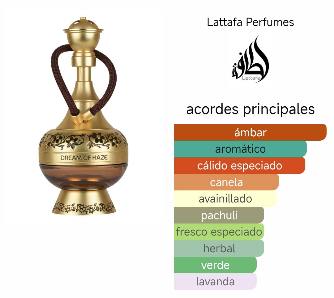 Dream of Haze se abre con un acorde de manzana shisha y menta, seguido de un corazón de canela, lavanda y artemisa. En la base, tabaco, pachulí, haba tonka y ámbar crean profundidad y calidez. Una fragancia unisex impactante y sofisticada que equilibra frescura e intensidad, ideal para una presencia memorable.