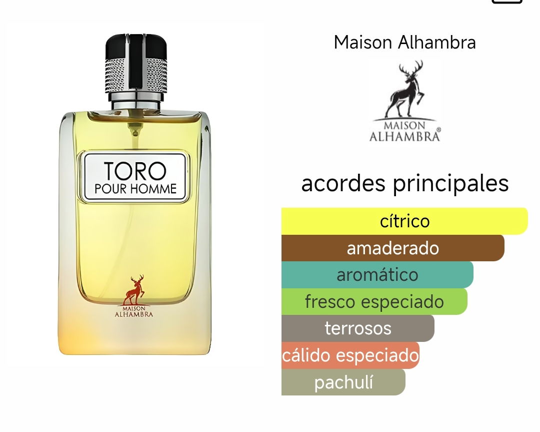 Toro Pour Homme es una fragancia aromática masculina que combina frescura e intensidad. Sus notas de salida presentan vibrantes notas cítricas de naranja y pomelo, creando una salida vigorizante. En el corazón, la combinación de pimienta y sardinheira aporta un toque especiado y herbal. El fondo amaderado con vetiver, pachulí, cedro y benjuí garantiza una estela sofisticada, impactante y duradera, ideal para hombres con una presencia fuerte y elegante.