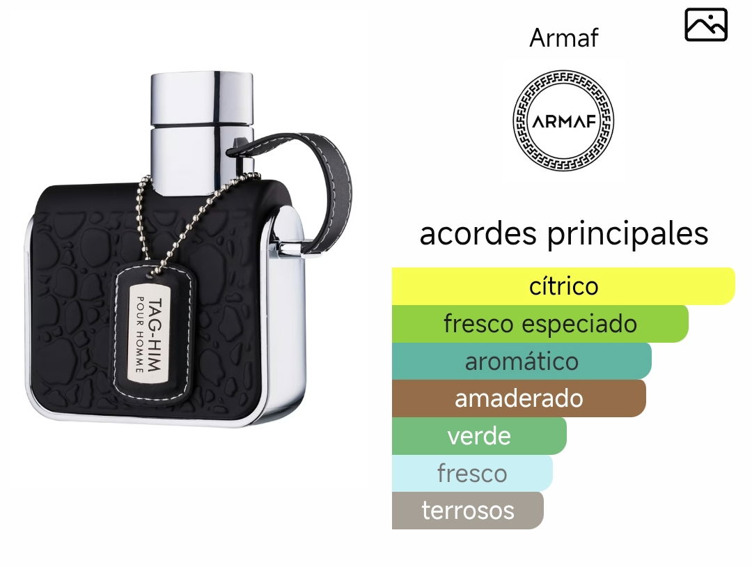 Tag-Him de Armaf es una fragancia de la familia olfativa Amaderada Especiada para Hombres. Las Notas de Salida son toronja (pomelo), limón (lima ácida), bergamota y pimienta rosa; las Notas de Corazón son jengibre, menta, lavanda y nuez moscada; las Notas de Fondo son vetiver, pachulí, sándalo y cedro.