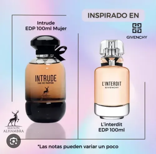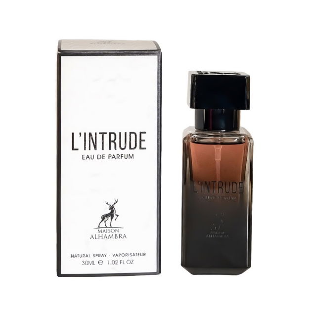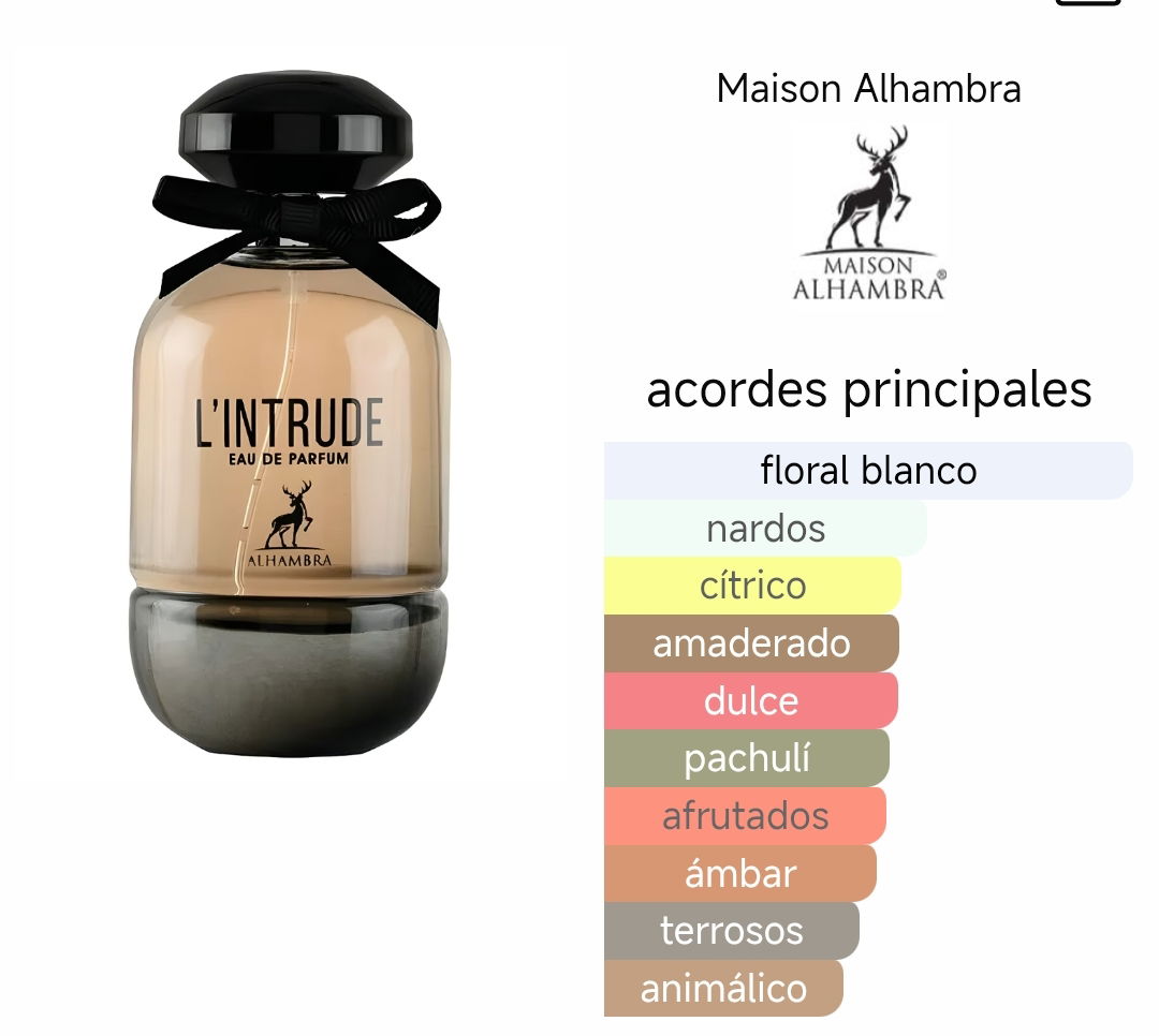 El perfume Maison Alhambra Intrude combina notas de bergamota y pera con un corazón de jazmín, nardos y flor de azahar. El fondo de ámbar, pachulí y vainilla crea una estela cálida y sofisticada. Su fragancia duradera lo hace ideal para el día a día o para ocasiones especiales, desbordando personalidad y encanto.