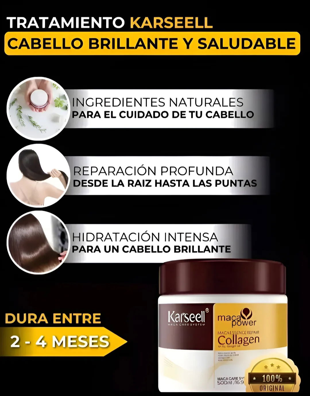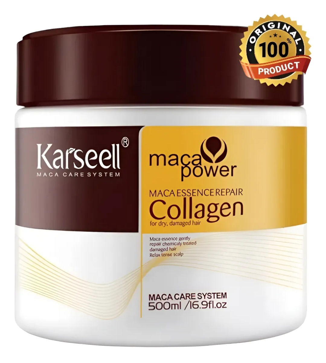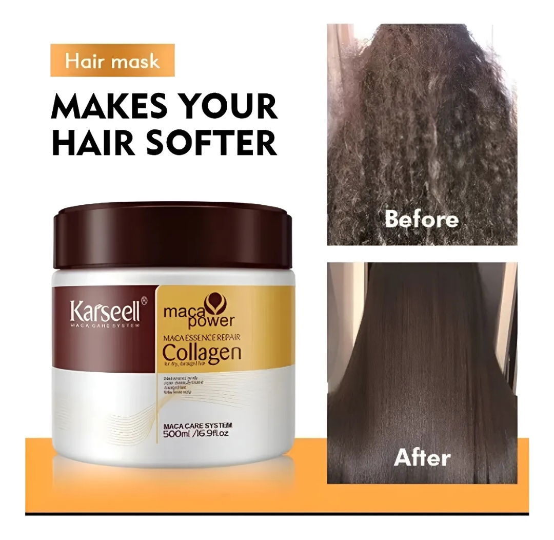 La mascarilla capilar de colágeno Karseell de 500 ml nutre profundamente el cabello con una combinación de colágeno, aceite de argán, manteca de karité y extractos botánicos. Repara el cabello seco o dañado, reduce el encrespamiento y restaura su brillo natural, reestructurando la fibra capilar. Su fórmula sin sulfatos ni parabenos es apta para todo tipo de cabello, incluso teñido o alisado. Úsala una o dos veces por semana después del champú, dejándola actuar de 10 a 15 minutos para recuperar la suavidad y el brillo.