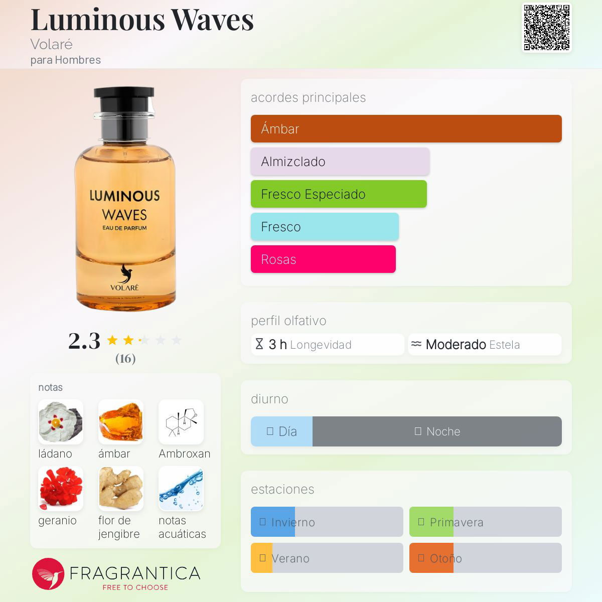 Volare Luminous Waves es una experiencia olfativa impactante y equilibrada. Su familia aromática acuática combina notas de salida frescas de pomelo, jengibre y bergamota, con un corazón vibrante de salvia y geranio. Las notas de fondo, con ambroxan y ámbar, garantizan sofisticación y durabilidad. Perfecta para quienes buscan frescura y elegancia en una fragancia unisex.