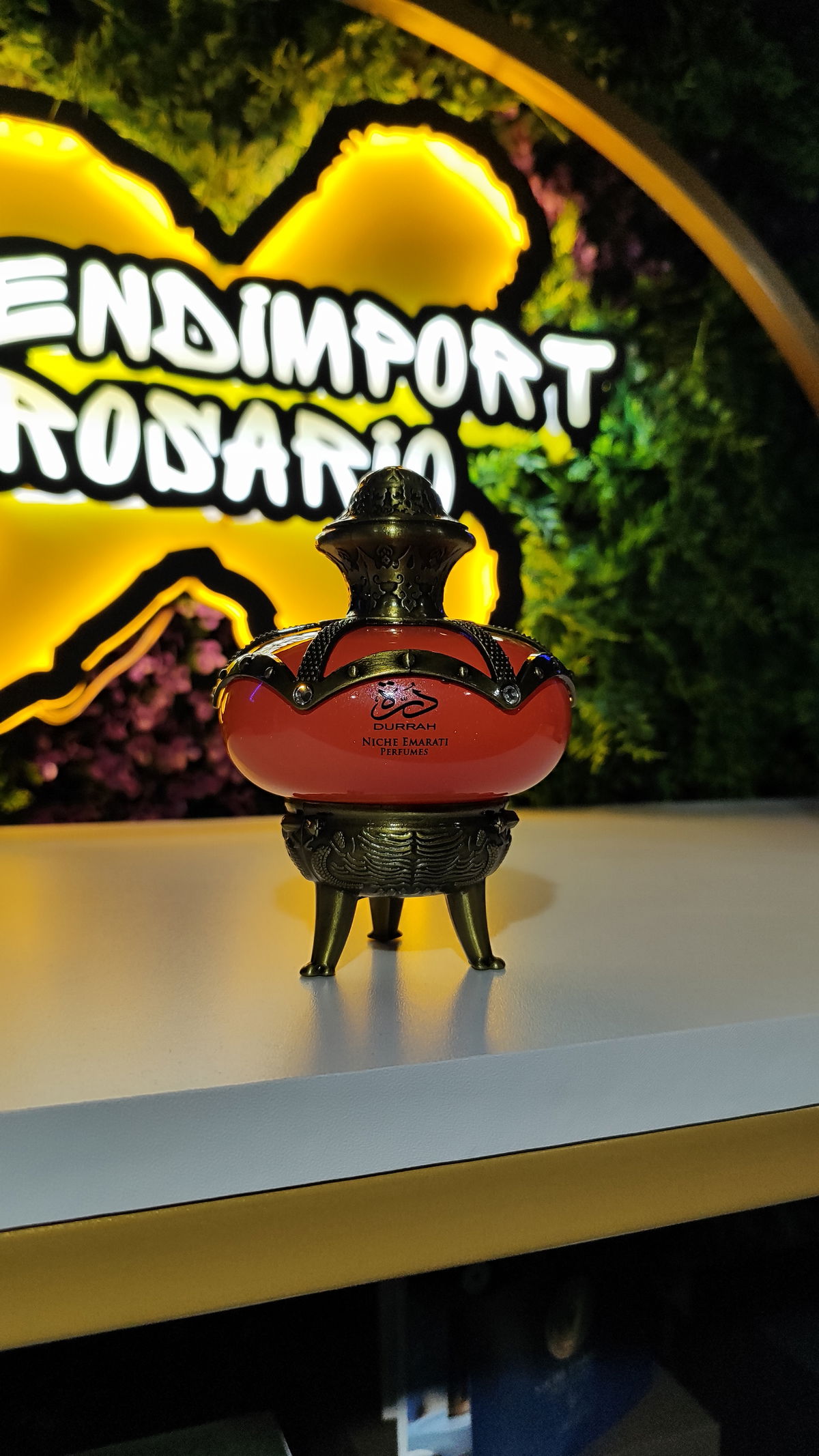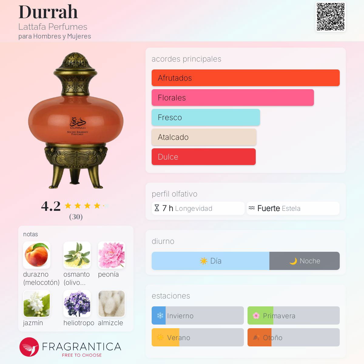 Durrah es una fragancia unisex, envolvente y sofisticada. Se abre con vibrantes notas de bergamota, lichi e hibisco, revelando un corazón floral y exótico de incienso, magnolia, rosa y violeta. Finaliza con la cálida intensidad del ámbar, la cachemira, el almizcle y la vainilla, creando una combinación impactante, equilibrada y duradera, perfecta para quienes buscan personalidad y elegancia en cualquier ocasión.