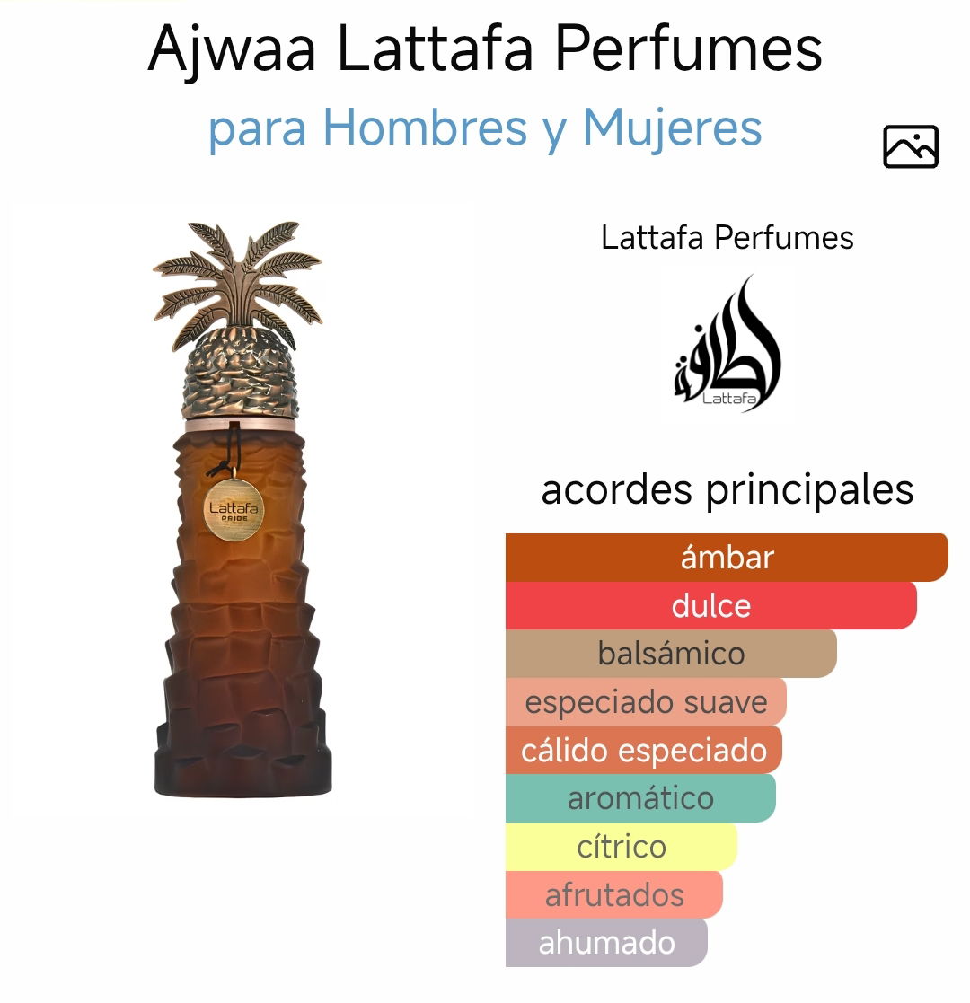 El Perfume Ajwaa es una fragancia oriental afrutada unisex que combina exotismo y sofisticación. Las notas de salida de dátil, elemí, limón y bergamota ofrecen una salida dulce y cítrica, rebosante de frescura. En el corazón, el toque distintivo de regaliz y la intensidad de la mirra crean una composición rica e intrigante. El fondo, marcado por la intensidad del benjuí y el incienso, proporciona un aroma impactante y envolvente.