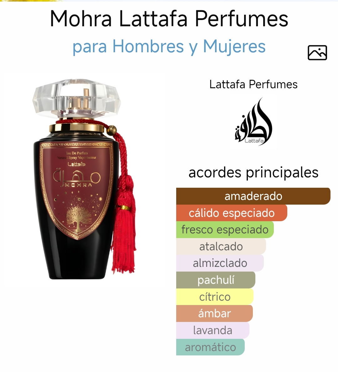 Mohra de Lattafa Perfumes es una fragancia de la familia olfativa para Hombres y Mujeres. Las Notas de Salida son lavanda, azafrán, naranja sanguina y bergamota; las Notas de Corazón son pimienta negra, cachemira y rosa; las Notas de Fondo son cedro, pachulí, sándalo, ládano y almizcle.