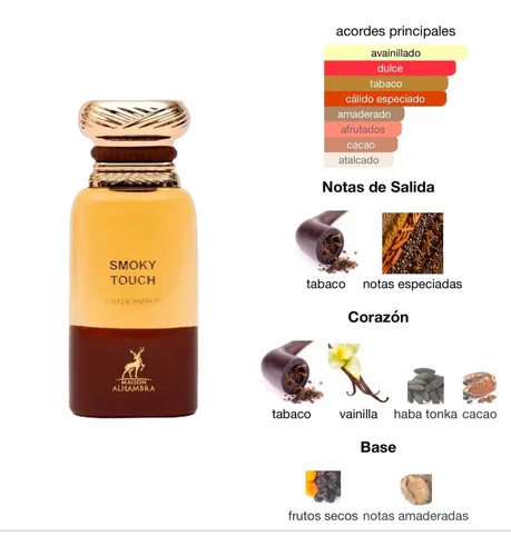 Maison Alhambra Smoky Touch EDP ofrece una encantadora fusión de tabaco ahumado, madera oscura y ámbar cálido, envuelto en especias de primera calidad. La fragancia se desarrolla con notas de cuero y vainilla que aportan profundidad y elegancia. Perfecto para veladas especiales o momentos en los que se busca una firma olfativa única.