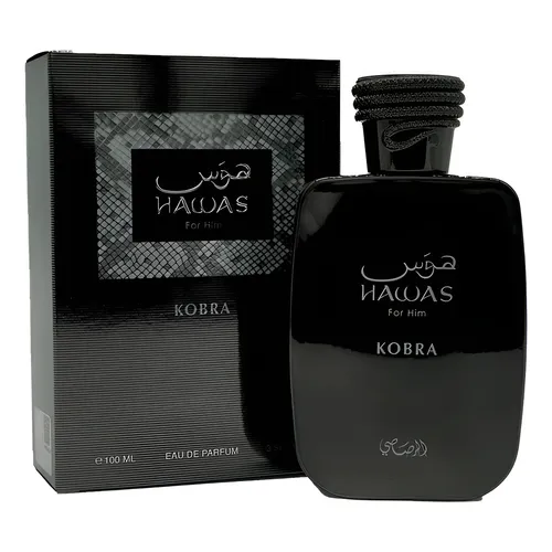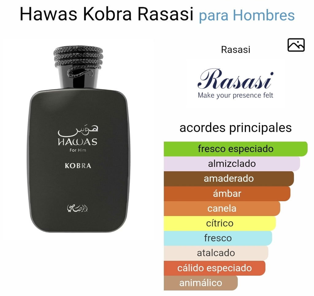 Hawas Kobra de Rasasi (lanzado en 2025) es un eau de parfum para hombre de la familia oriental amaderada, caracterizado por un aroma cítrico, especiado y "bestia" en duración. Destaca por notas de jengibre, bergamota y canela, diseñado para hombres audaces y modernos con una fijación intensa.