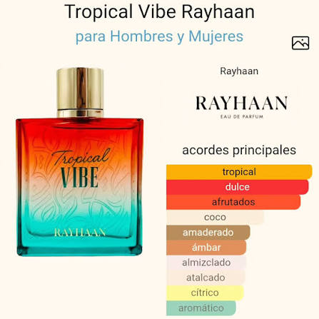Rayhaan Tropical Vibe (2025) es un Eau de Parfum unisex, fresco y frutal, ideal para el verano y climas cálidos. Esta fragancia árabe de 100 ml destaca por sus notas jugosas de mango, piña y coco sobre un fondo cremoso de sándalo y almizcle, evocando un cóctel tropical alegre y duradero.