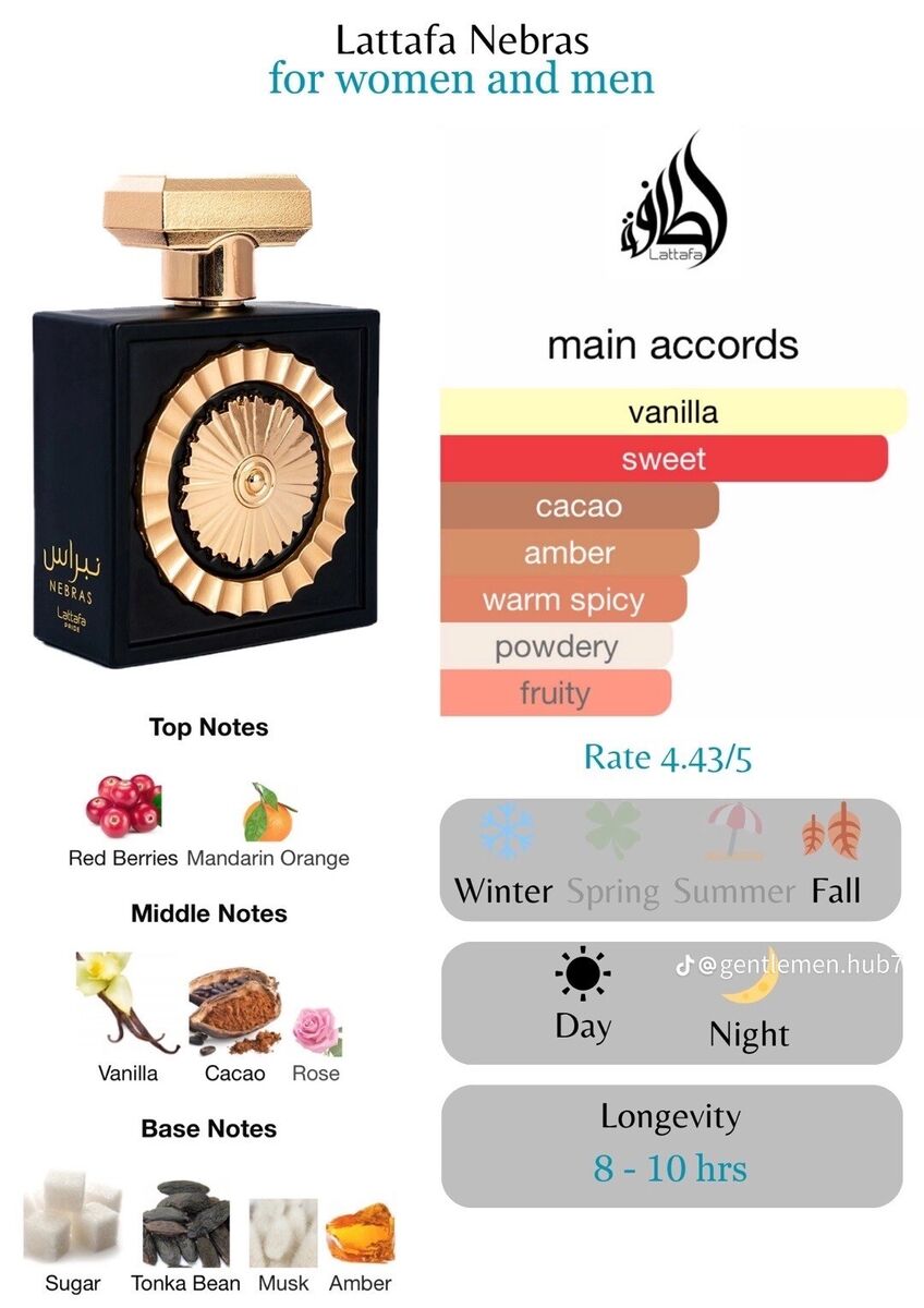 Nebras Perfume es una fragancia unisex de vainilla y ámbar que combina dulzura y sofisticación. Las notas altas de frutos rojos y mandarina ofrecen una apertura afrutada y vibrante, llena de frescura. En el corazón, la combinación de Vainilla, Cacao y Rosa crea un toque dulce y envolvente, aportando calidez y elegancia al aroma. Para terminar, las notas de azúcar, haba tonka, ámbar y almizcle proporcionan una base rica y acogedora.