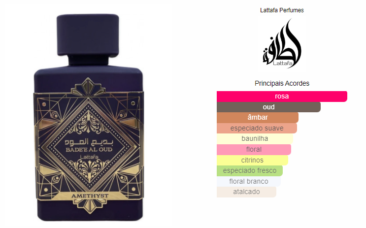 El Perfume Al Oud Amethyst es una fragancia cautivadora que combina tradición y modernidad. Comienza con notas altas de pimienta rosa y bergamota, ofreciendo una apertura especiada y cítrica. En el corazón, el perfume se despliega en una lujosa armonía floral, con la presencia de rosa turca, rosa búlgara y jazmín. El final revela una base profunda y envolvente de madera de agar (oud), ámbar y vainilla, aportando una estela cálida, dulce e inolvidable.